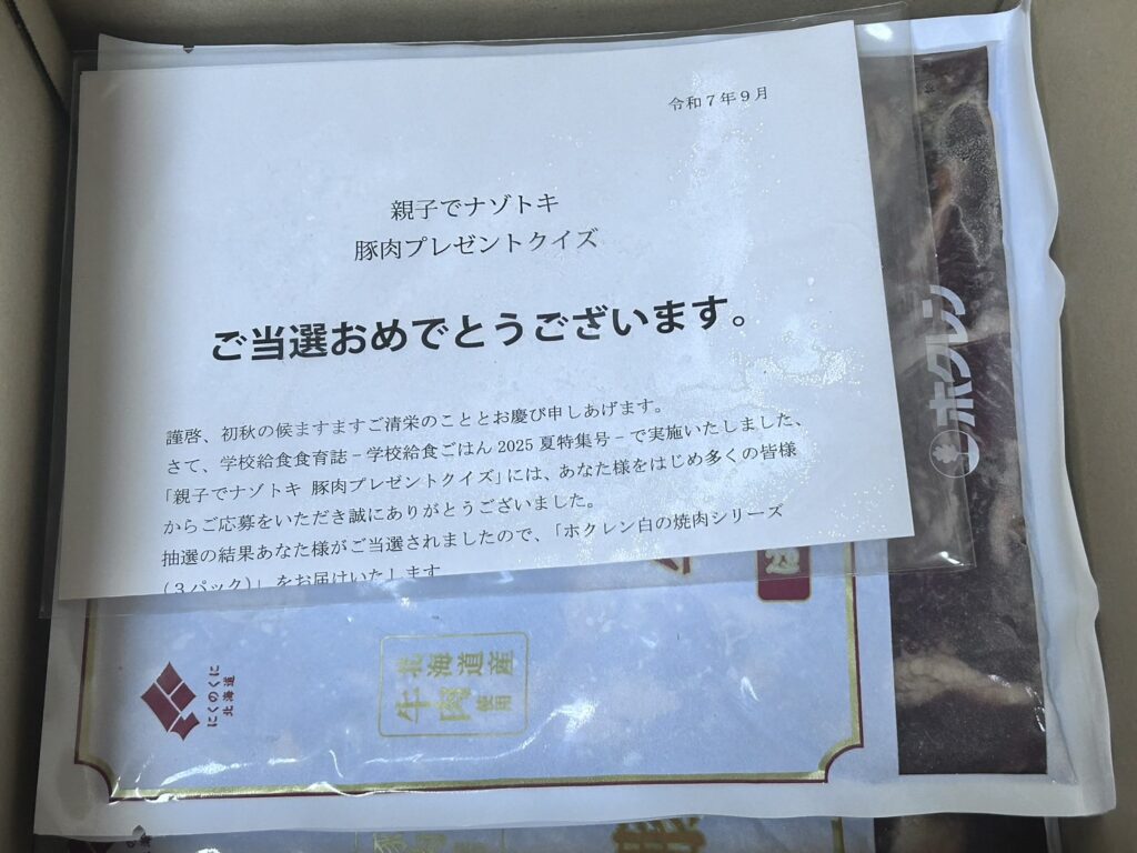 ある日、子どもが学校から持ち帰った「学校給食食育誌」を何気なくめくっていたところ、「親子でナゾトキ 豚肉プレゼントクイズ」が掲載されていました。